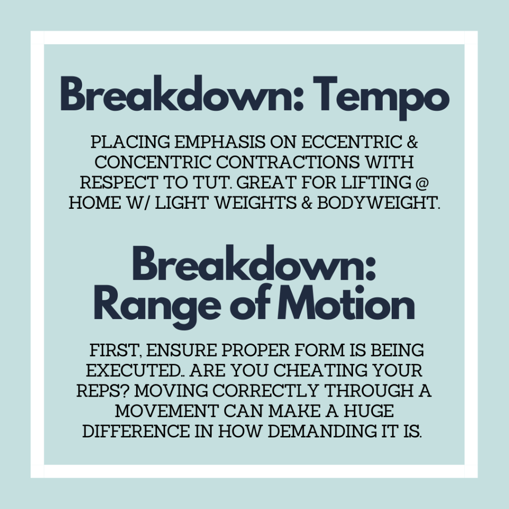 Tempo is a fun one. Sick and tired of bodyweight squats at home? Tell me, how quickly are you moving through a set? Odds are, you’re probably going through the motions, up, down, up, down, 1, 2, 1, 2…